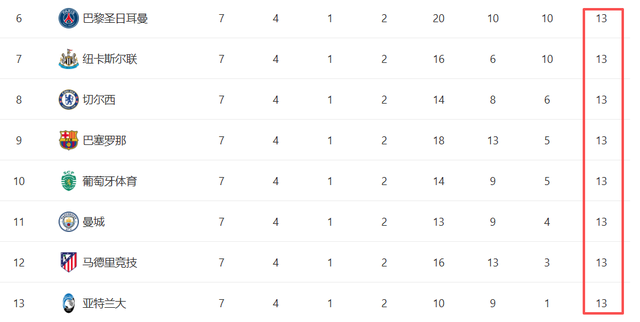 巴黎圣日耳曼13分10个净胜球,纽卡13分10个净胜球,切尔西13分6个净胜球,巴萨13分5个净胜球,葡萄牙体育13分5个净胜球,曼城13分4个净胜球,马竞13分3个净胜球,亚特兰大13分1个净胜球。
