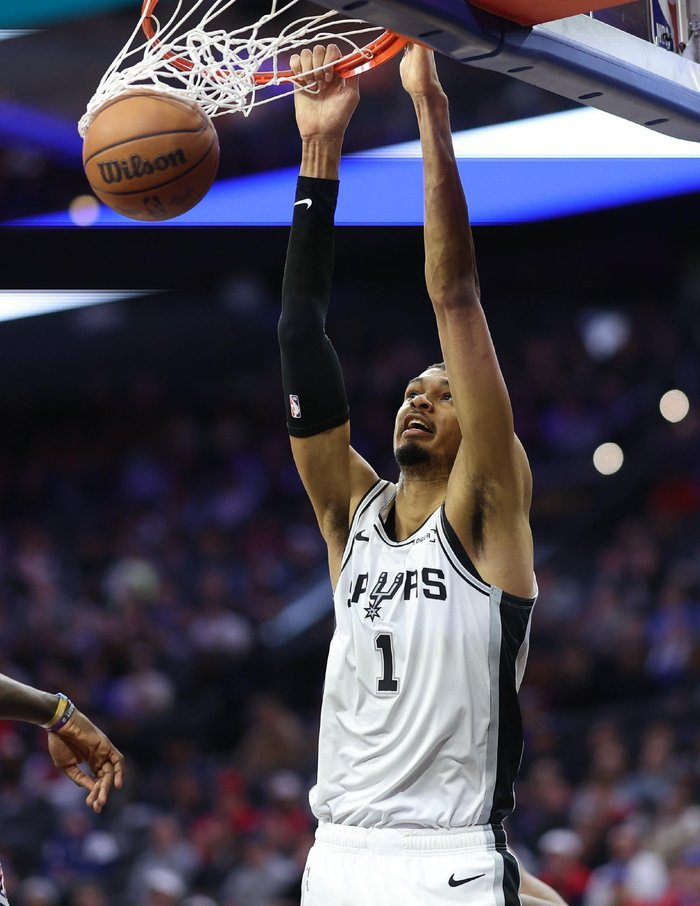 文班能里能外,卡斯尔、福克斯、哈珀、尚帕尼、瓦塞尔、凯尔登都有持球突击能力,马刺是纯粹的多持球点打法——单点突破压缩防守,团队分享球,寻找最佳出手机会。